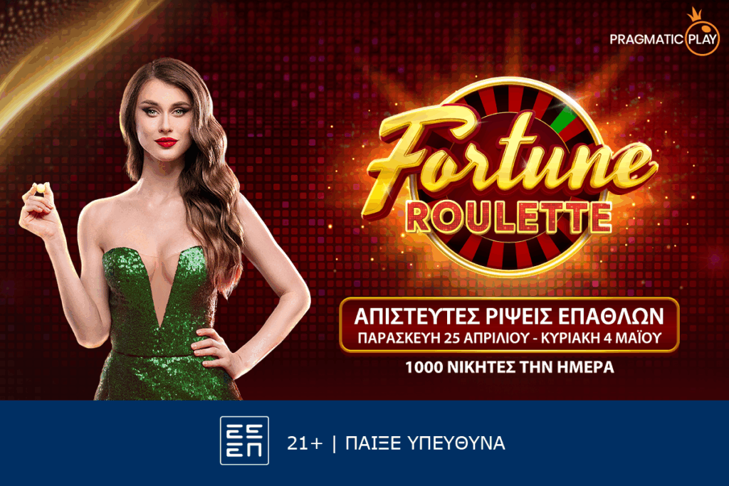 Μοναδική προσφορά* γεμάτη έπαθλα από την Παρασκευή 25 Απριλίου έως την Κυριακή 4 Μαΐου 2025 στη live Fortune Roulette της Pragmatic Play.