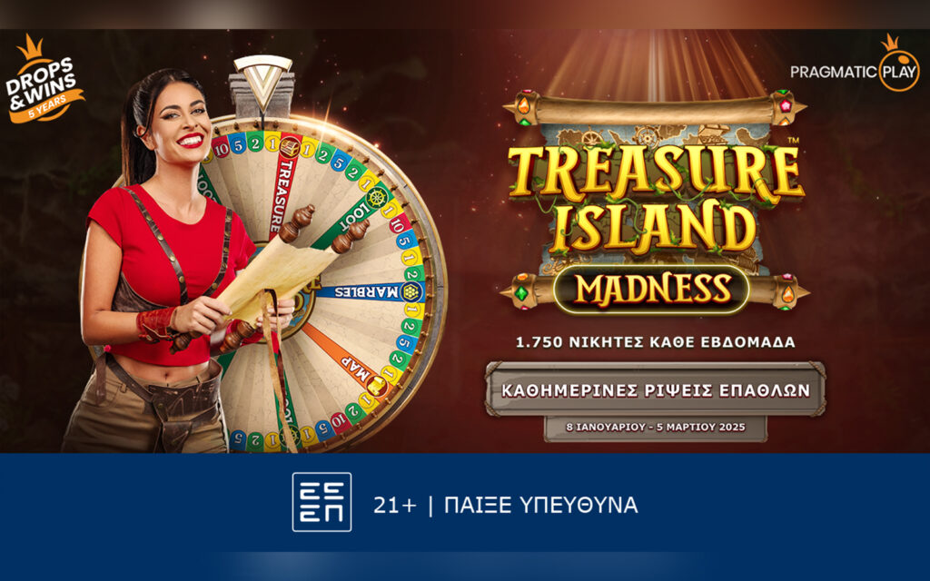 Και το 2025, τα Drops & Wins συστήνονται με ένα αγαπημένο live παιχνίδι, το Treasure Island, μέσω του τουρνουά Treasure Island Madness! Καθοδηγούμενοι από έναν χάρτη θησαυρού στη ζούγκλα της Pragmatic Play, οι παίκτες θα ανακαλύψουν έναν τεράστιο τροχό, που γυρίζει ασταμάτητα και προσφέρει μεγάλους πολλαπλασιαστές και έξι συναρπαστικούς γύρους επιβράβευσης. Το παιχνίδι γίνεται ακόμα καλύτερο με ρίψεις επάθλων κάθε μέρα στο πλαίσιο του τουρνουά Treasure Island Madness*!