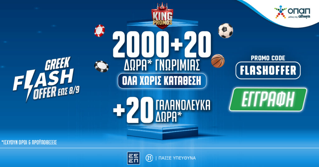 Με τη σούπερ προσφορά* γνωριμίας του Pamestoixima.gr, το παιχνίδι σου αλλάζει επίπεδο κι απολαμβάνεις στο έπακρο τα παιχνίδια των εθνικών ελληνικών ομάδων! Μέχρι τη Δευτέρα (08/09, 23:59) 2.140 έπαθλα* μπορούν να γίνουν δικά σου με το promo code FLASHOFFER, εντελώς δωρεάν* χωρίς κατάθεση, για να διασκεδάσεις με όλα τα αθλητικά δρώμενα, και ειδικά τα παιχνίδια της Εθνικής Ομάδας σε μπάσκετ και ποδόσφαιρο, αλλά και να περάσεις ευχάριστες στιγμές στο live casino.