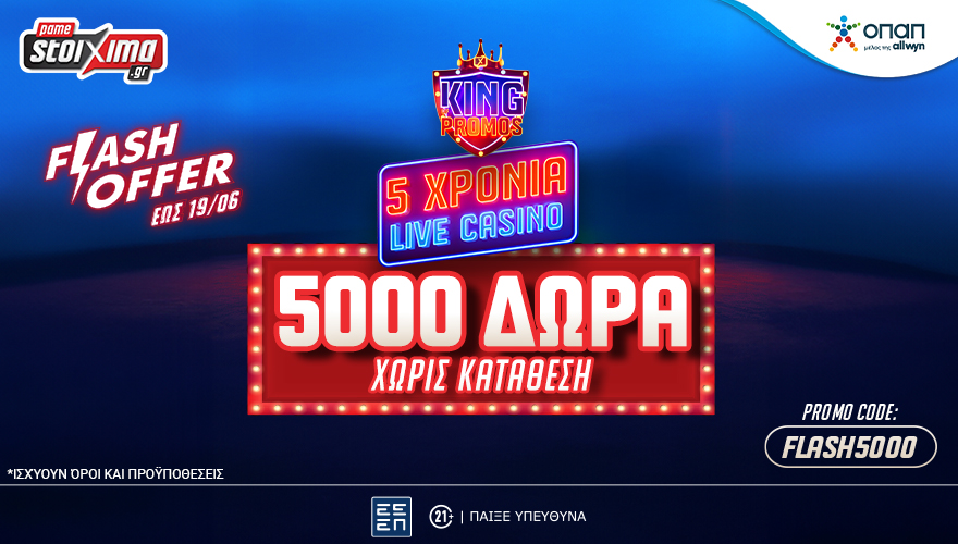Με τη σούπερ προσφορά* γνωριμίας του Pamestoixima.gr, η εμπειρία σου περνά σε άλλο επίπεδο! Μόνο για 4 ημέρες (από Κυριακή 16/06 έως και Τετάρτη 19/06, 23:59), 5.000 έπαθλα* μπορούν να γίνουν δικά σου, εντελώς δωρεάν, μόνο με τη χρήση του promo code FLASH5000 κατά την εγγραφή, χωρίς να απαιτείται κατάθεση.