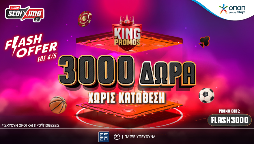 Με τη σούπερ προσφορά* γνωριμίας του Pamestoixima.gr, το παιχνίδι σου αλλάζει επίπεδο! ΜΟΝΟ ΓΙΑ 3 ΗΜΕΡΕΣ (μέχρι Κυριακή 04/05, 23:59) 3.000 έπαθλα* μπορούν να γίνουν δικά σου με το promo code FLASH3000, εντελώς δωρεάν* χωρίς κατάθεση, για να διασκεδάσεις με όλα τα αθλητικά δρώμενα, αλλά και να περάσεις ευχάριστες στιγμές στο live casino.