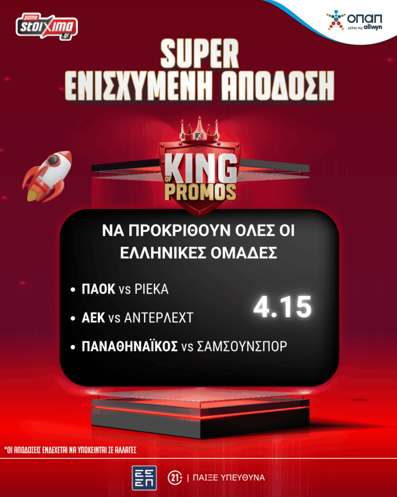 *Ισχύουν Όροι & Προϋποθέσεις. Οι αποδόσεις ενδέχεται να υπόκεινται σε αλλαγές. **Ισχύει για την αγορά «Τελικό Αποτέλεσμα – Ενισχυμένες Αποδόσεις» πριν την έναρξη του αγώνα. «21+ |Αρμόδιος Ρυθμιστής ΕΕΕΠ | Κίνδυνος εθισμού & απώλειας περιουσίας | ΓΡΑΜΜΗ ΣΤΗΡΙΞΗΣ: 1114| Παίξε Υπεύθυνα |».