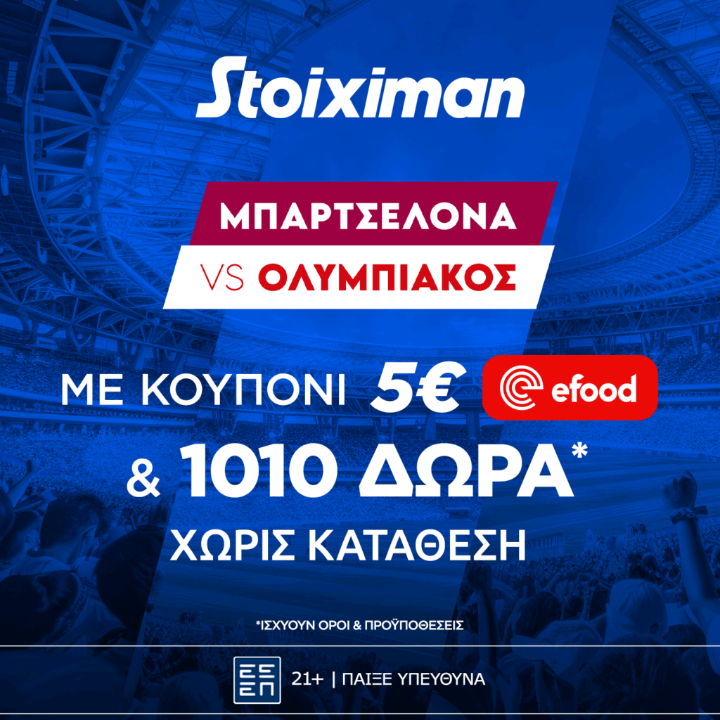 Προσφορά* γνωριμίας από τη Stoiximan με 1010 δώρα* και κουπόνι efood χωρίς κατάθεση*!