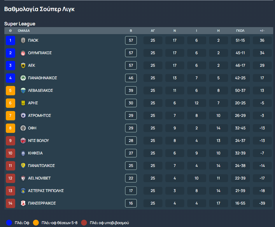 Πάμε όμως να βάλουμε τα πράγματα σε μια σειρά. Κάποιο ντέρμπι δεν ξεχωρίζει, ενώ βαθμολογικά λίγα είναι τα ματς που έχουν πραγματικό ενδιαφέρον. Η πρώτη τετράδα είναι εξασφαλισμένη (ΠΑΟΚ, Ολυμπιακός, ΑΕΚ και Παναθηναϊκός), υπάρχει ωστόσο μια μικρή… σύγχυση στις θέσεις 5-8. Με εξαίρεση τον Λεβαδειακό, πέντε ομάδες βρίσκονται στο κόλπο της διεκδίκησης των υπολοίπων τριών θέσεων.
