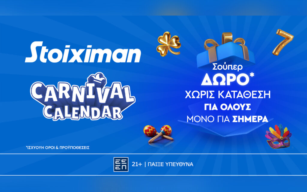 Μία υπέροχη εβδομάδα αρχίζει για σένα στη Stoiximan. To Carnival Calendar, ένα ημερολόγιο προσφορών με καθημερινές εκπλήξεις, δώρα* κι έπαθλα* και στο Live Casino, κάνει πρεμιέρα με 5 δώρα* σε όλους!